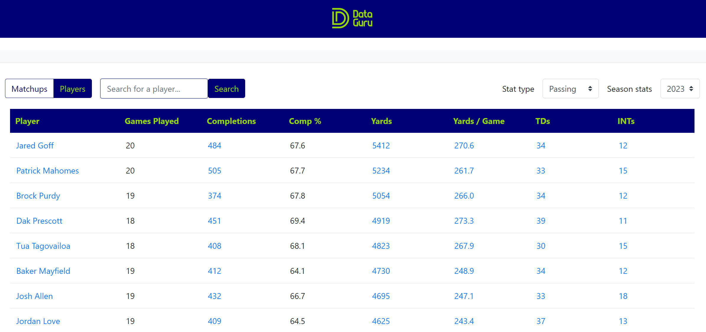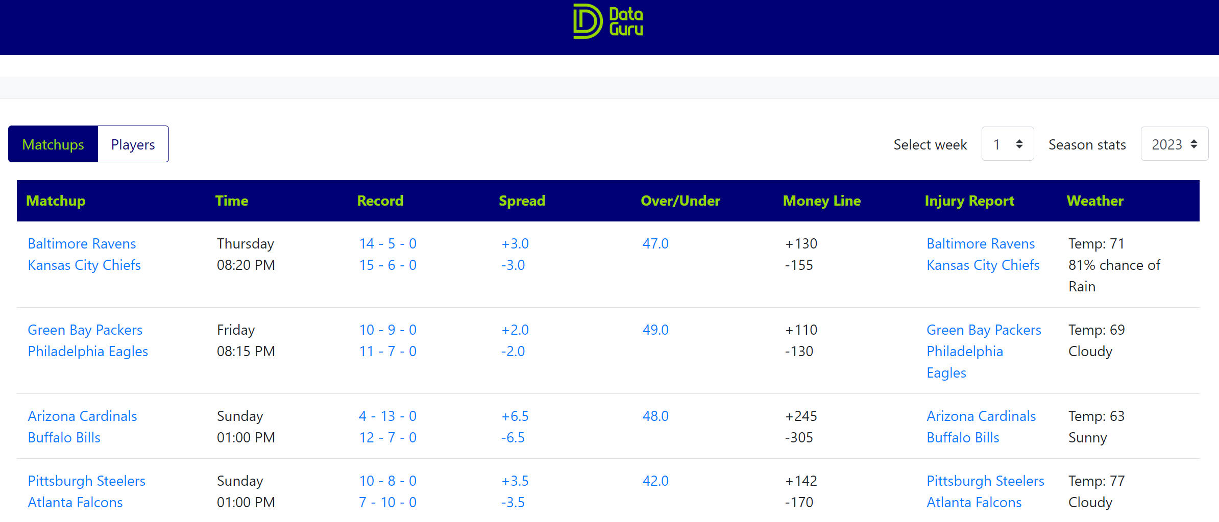 Welcome to Data Guru, the premier destination for NFL data and insights. Our website is designed to empower sports enthusiasts, analysts, and bettors with comprehensive NFL statistics, helping them make well-informed decisions with confidence.